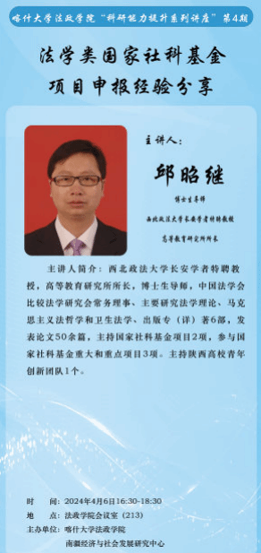 2024年4月6日下午,由法政学院、南疆经济与社会发展研究中心举办的法政学院“科研能力提升系列讲座”第4期在法政学院会议室隆重举行。