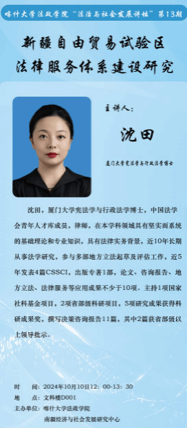 2024年10月10日,喀什大学法政学院开展了主题为“新疆自由贸易试验区法律服务体系建设研究”的主题讲座。本次讲座由法政学院党总支副书记、院长杨陶主持,中国法学会青年人才库成员沈田老师主讲。2024级法学专业硕士研究生、180位法学专业本科生参加本次讲座。