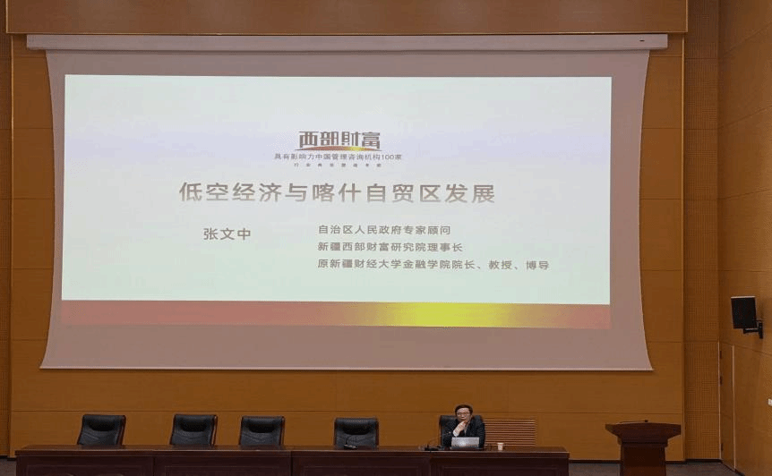 当天,张文中教授以《低空经济与喀什自贸区发展》为主题,阐述了在新形势下喀什自贸区引入低空经济的优势以及不同领域的发展方略,并根据存在的问题提出相关改进措施,以助力“一带一路”核心区建设和喀什自贸区建设。