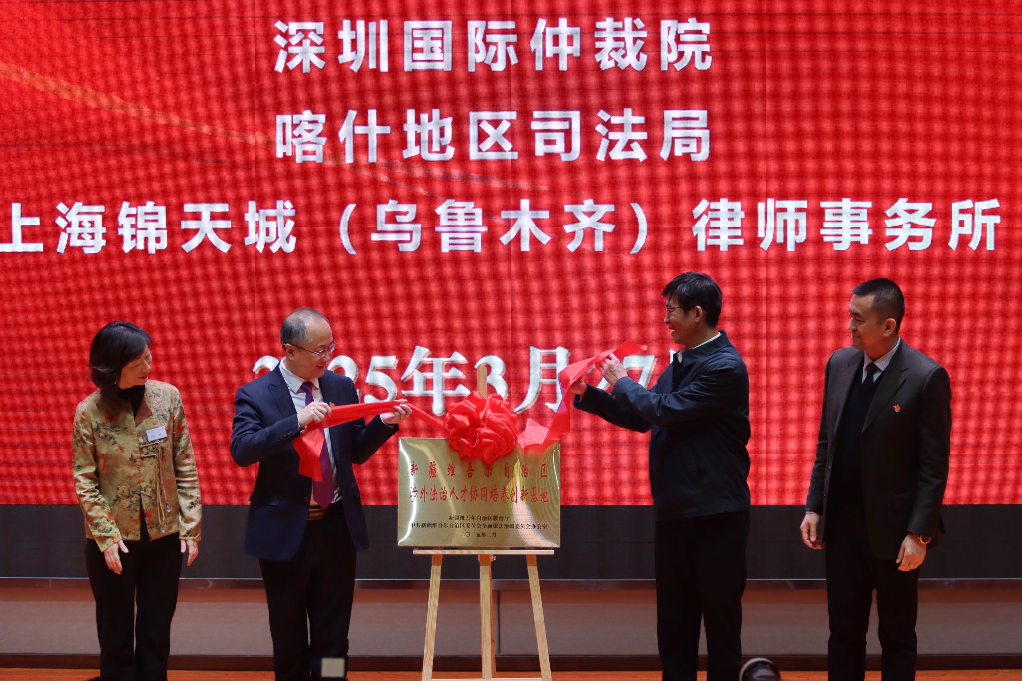 仪式上,喀什大学校党委副书记邓勇,喀什地区司法局党组副书记、局长外力·克衣木,深圳国际仲裁院院长刘晓春,深圳国际仲裁院副院长兼喀什分院院长安欣共同为新疆维吾尔自治区涉外法治人才协同培养创新基地揭牌。