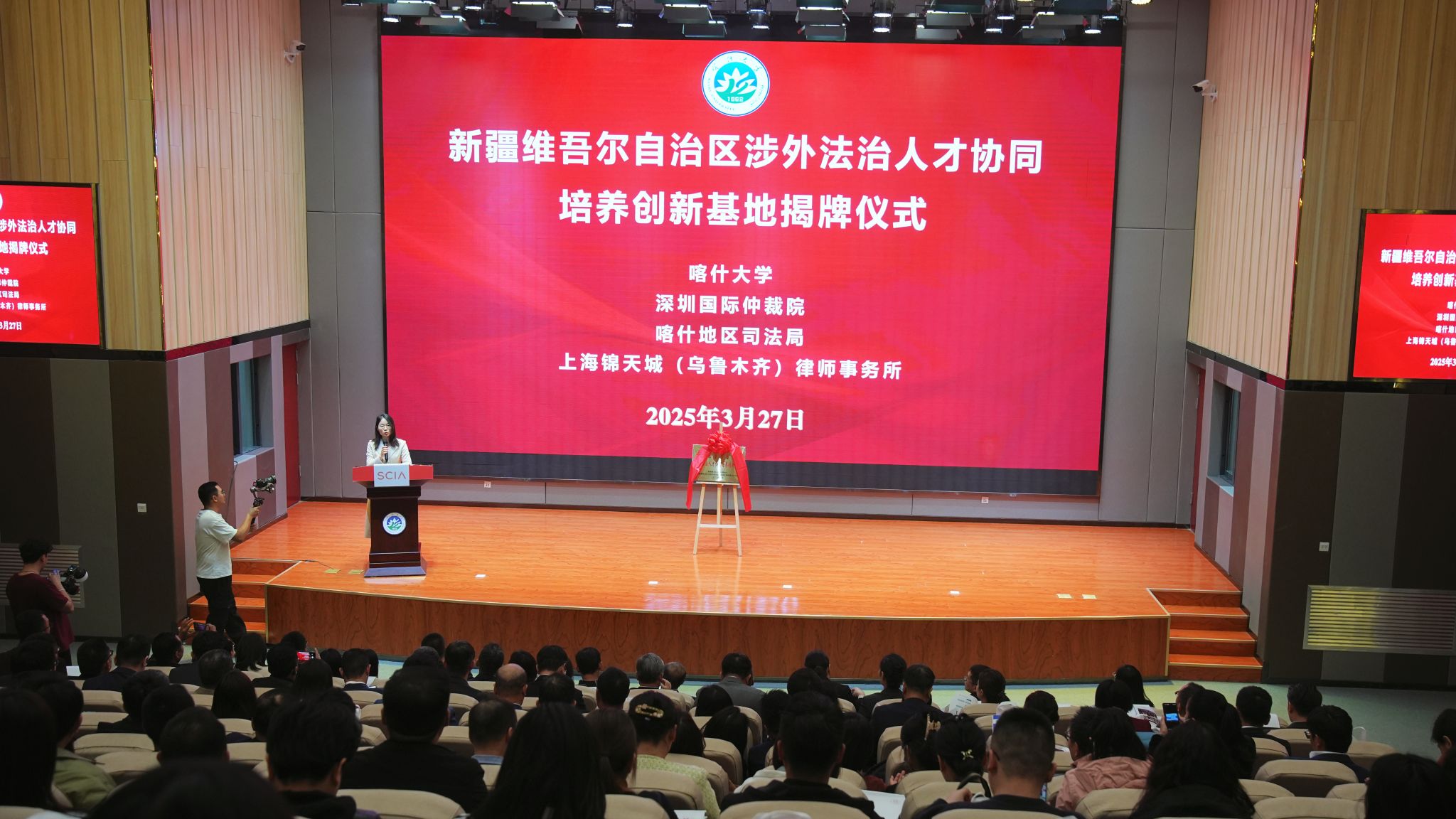 2025年3月27日下午,喀什大学深圳国际仲裁院、喀什地区司法局上海锦天城(乌鲁木齐)律师事务所联合申报并获批的新疆维吾尔自治区涉外法治人才协同培养创新基地在我校举行揭牌仪式。喀什大学校党委副书记邓勇,喀什地区司法局党组副书记、局长外力·克衣木,深圳国际仲裁院院长刘晓春,深圳国际仲裁院副院长兼喀什分院院长安欣出席揭牌仪式,2025年自治区“学习贯彻习近平法治思想 加强涉外法治建设 服务新疆自贸试验区高质量发展”专题研修班学员、喀什大学法政学院“涉外法治人才实验班”全体学生出席揭牌仪式。活动由喀什大学法政学院党委副书记、院长杨陶主持。