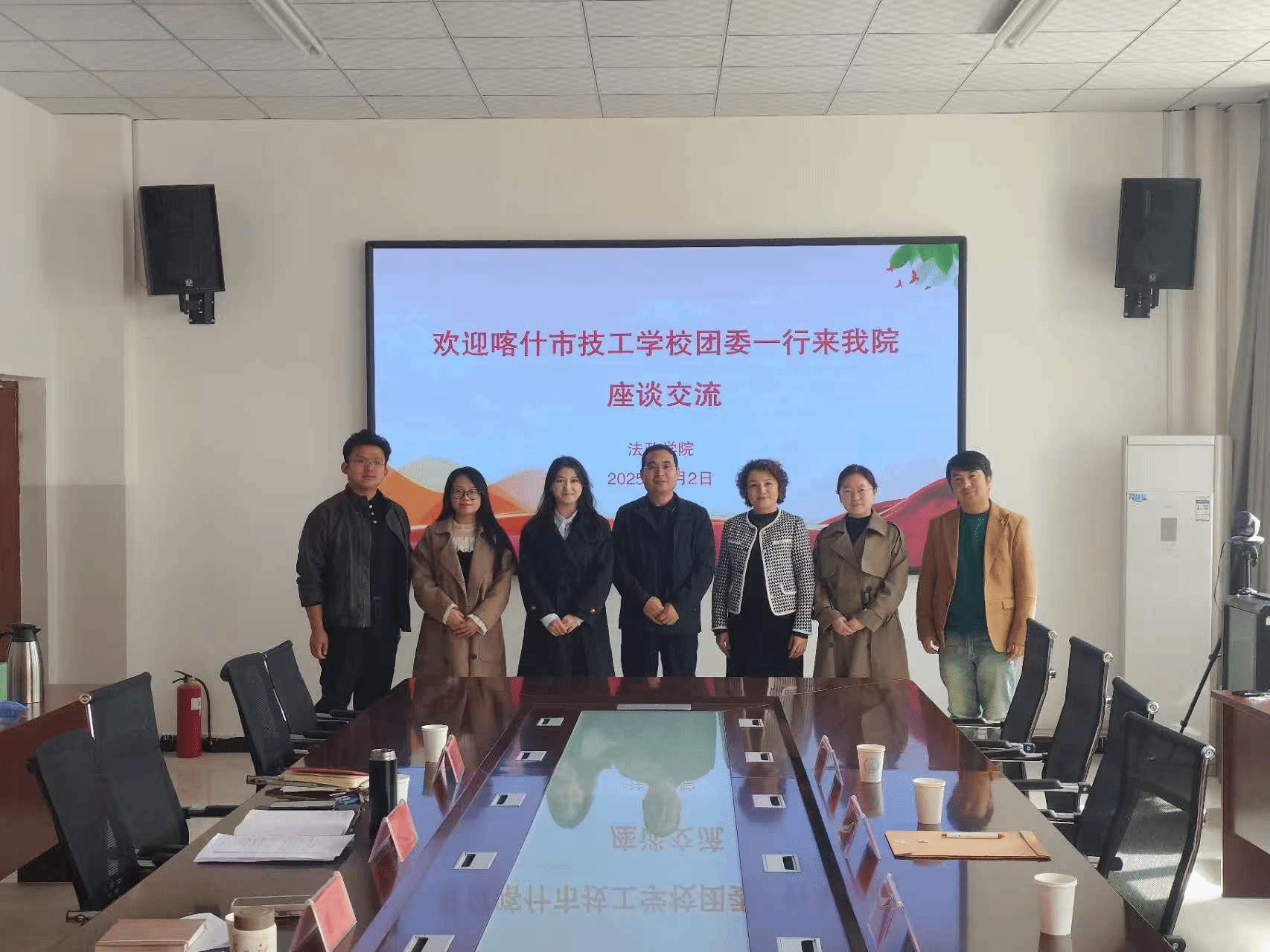 为进一步促进校际合作,2025年4月2日上午,喀什技工学校团委代表到我院参观交流。双方就法政学院选派学生志愿者前往技工学校开展文化润心服务教授舞蹈技艺以及选派实习生建设实践基地等内容展开座谈交流。喀什技工学校团委书记阿依努尔・库尔班、团委干事努尔麦麦提・米吉提教师代表阿衣努·阿布拉,法政学院党委副书记李宏斌、社会工作系主任周艳、学工办副主任唐倩学生志愿者代表参加座谈