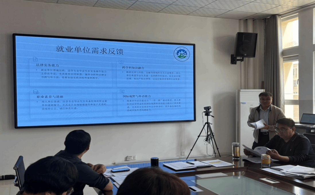 法学专业负责人王远朝老师从课程体系优化、实践教学强化、思政元素融入三方面展开进行了汇报,提出增设“基层社会治理”“涉外法律实务”等特色课程,构建“理论+案例+实训”三位一体教学模式,并增设跨专业课程,从而提高学生综合素质。