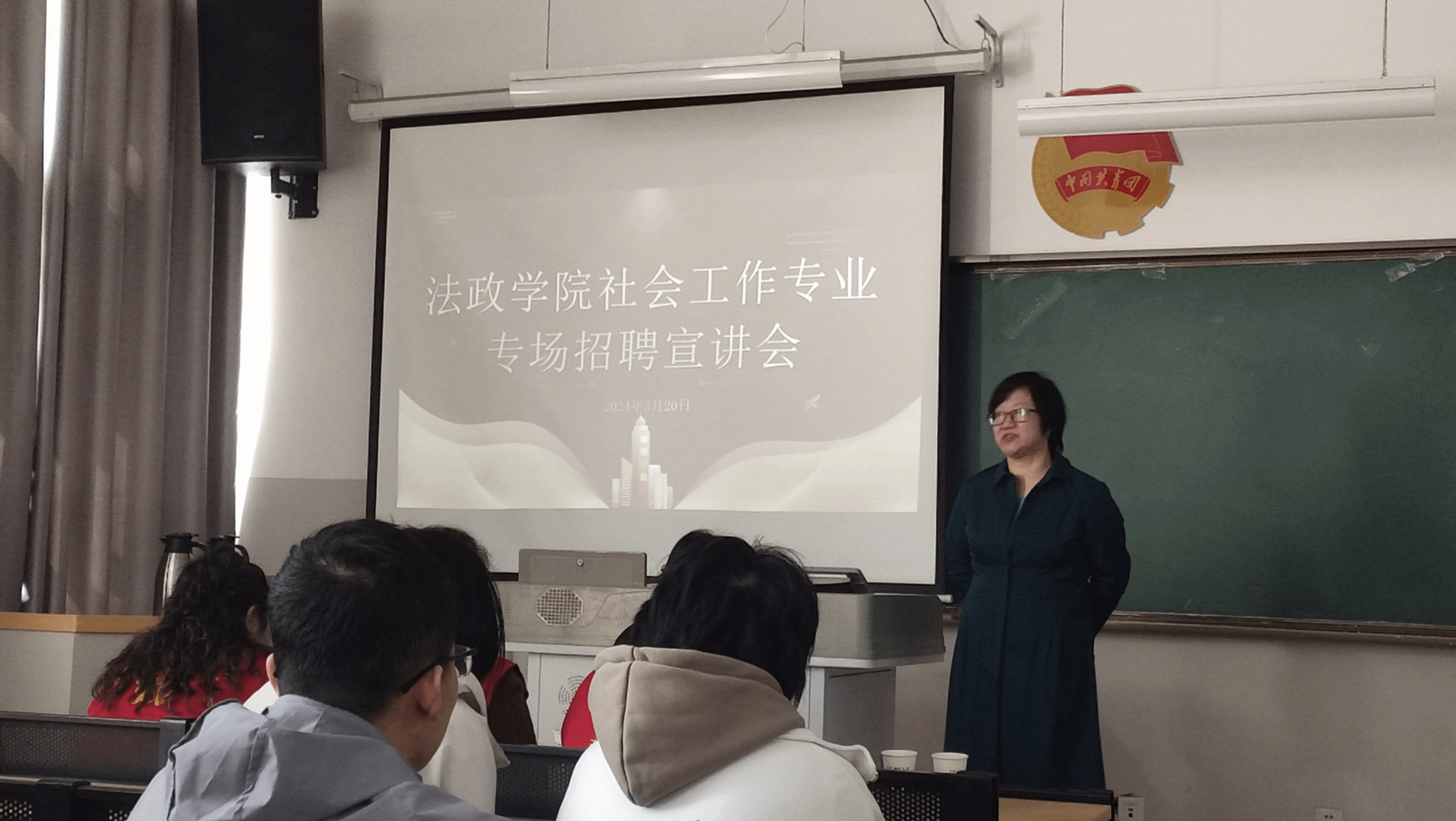 为加强学院与用人单位之间的交流合作,更好推进2024届毕业生实现高质量就业,按照喀什大学2024年“访企拓岗促就业专项行动” 工作方案、喀什大学就业指导中心《关于做好各学院专场招聘会组织工作的通知》要求,法政学院于3月20日邀请喀什市石榴花开社会工作服务中心和喀什大拇指集善服务中心两家用人单位到校举办社会工作专业专场招聘宣讲会。