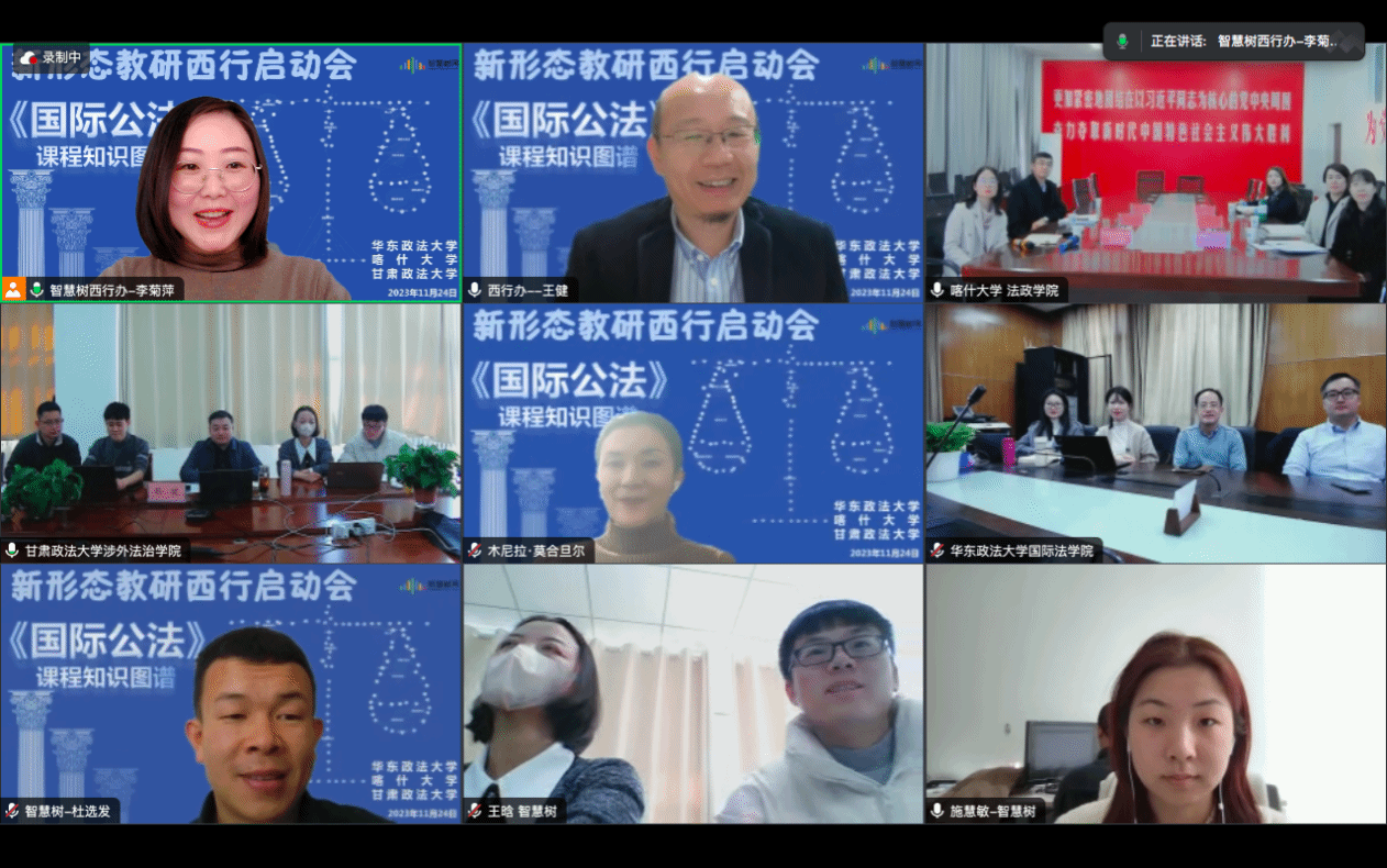 为深入推进教育部高教司“慕课西行2.0”行动,探索基于新形态知识图谱的教学与教研创新,把虚拟教研室建设做实做深,探索西行项目从以“输血”为主向以全面提升西部学校教师教学能力的“造血”的转变,11月24日上午,喀什大学法政学院以线上线下结合形式参加《国际公法课程知识图谱》新形态教研西行项目启动会。喀什大学法政学院、华东政法大学国际法学院、甘肃政法大学涉外法治学院等三所合作院校及智慧树网的相关领导、教师和工作人员参与会议。