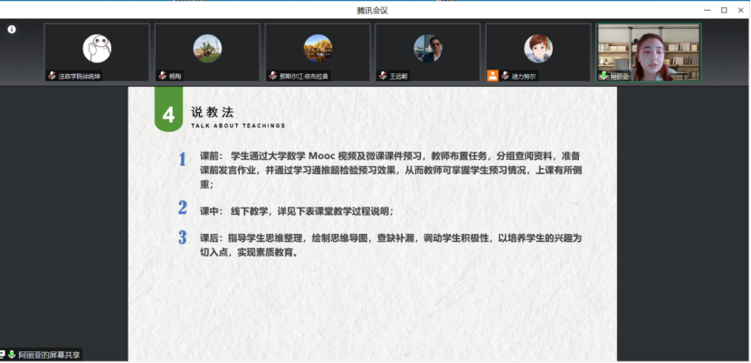 集体备课于2月3日16:00正式开始。首先由阿丽亚·亚力昆老师就其课程进行了备课情况的展示。阿丽亚·亚力昆老师按照教学设计的内容,就课程的教学环节、教学重点、教学反思等五个方面进行了展示,同时在展示结束后就备课中的疑惑,如教学环节设置、思政元素引入等方面向与会老师进行探讨。作为第一次备课的主讲教师,阿丽亚·亚力昆老师的备课内容受到领导和老师们的一致好评,纷纷夸赞其用心、细心。随后,杨陶老师首先就《国际私法》课程中的教学经验进行了分享,同时也就阿丽亚·亚力昆老师在备课中的相关改进内容提出了自己的建议。迪力夏提·阿木提、那斯尔江·依不拉音老师分别从思政元素引入、教学目标设置、教学环节设计等多方面提出了自己的看法和建议。法学教研室其他老师在会后也通过多种形式与阿丽亚·亚力昆老师就相关备课内容进行了交流和探讨。