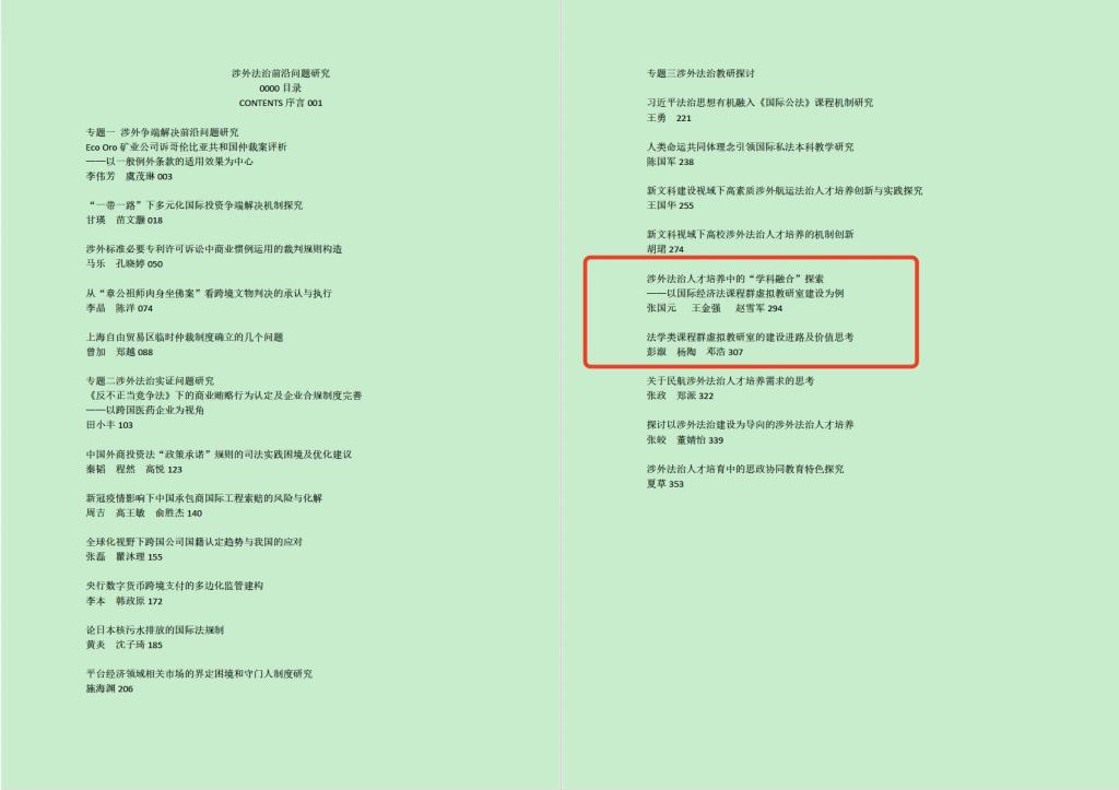 2023年9月初,正值《〈国际经济法〉课程群虚拟教研室》获我校虚拟教研室建设项目立项并建设一年之际,由华东政法大学、喀什大学、新疆理工学院和上海对外经贸大学等沪疆两地四校教师联合撰写的两篇教学研究论文《法学类课程群虚拟教研室的建设进路及价值思考》、《涉外法治人才培养中的“学科融合”探索—以国际经济法课程群虚拟教研室建设为例》被《涉外法治前沿问题研究》(《国际法与涉外法治文库》)收录,由上海人民出版社出版发行。