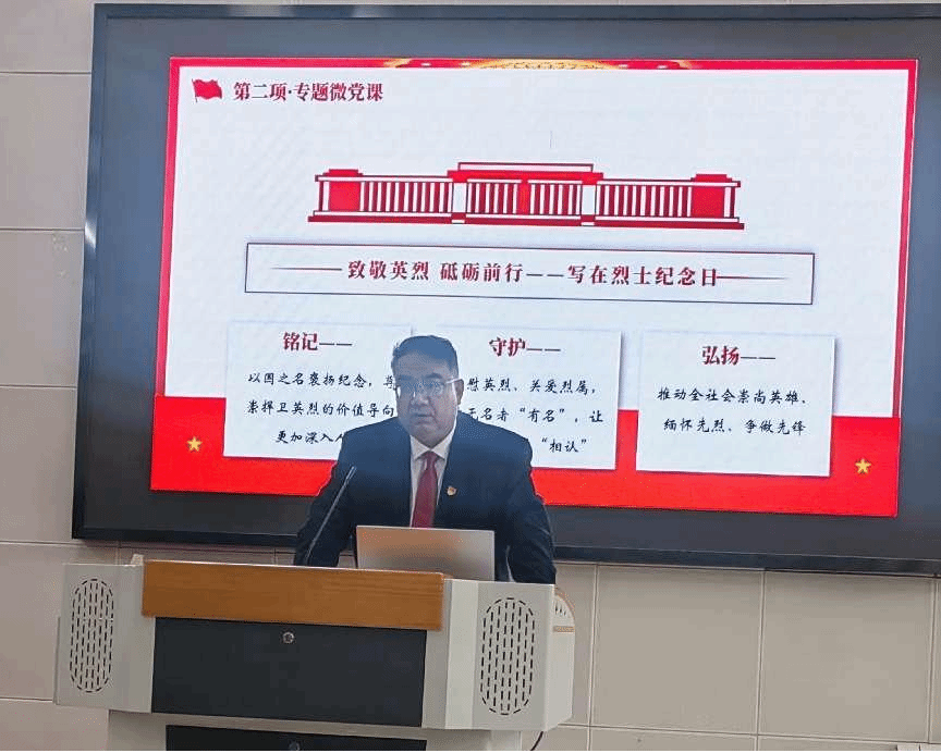 随后,法政学院党总支书记迪力夏提·阿木提同志以“致敬英烈,砥砺前行”为主题讲述了一堂生动的专题党课,他以人民网相关文章为参考,深入阐述了革命先烈们的英勇事迹和崇高精神,号召全体党员铭记先烈、守护先烈、弘扬并传承先烈精神,为实现党的宏伟目标而努力奋斗。