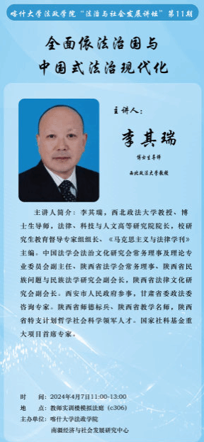依法治国是中国特色社会主义法治体系的核心内容,也是国家治理体系和治理能力现代化的重要标志。2024年4月7日,喀什大学法政学院开展了主题为“全面依法治国与中国式法治现代化”的讲座。本次讲座由法政学院副院长杨陶主持,西北政法大学李其瑞教授主讲。法学教研室教师及法学2103班、2104班全体学生参加本次讲座。