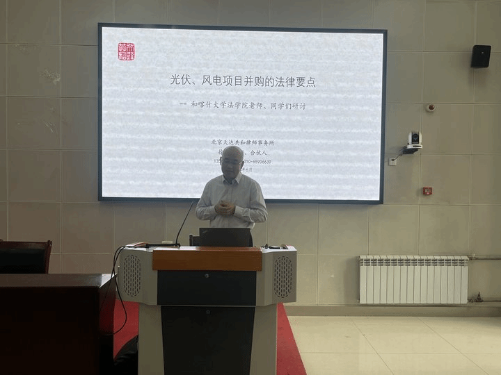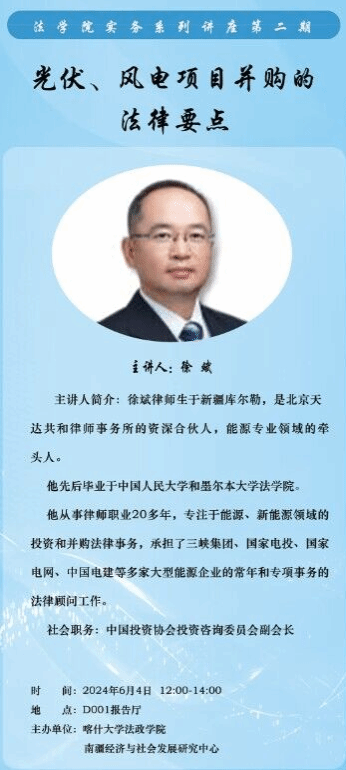 2024年6月4日上午,由喀什大学法政学院与南疆经济与社会发展研究中心举办的法政学院实务系列讲座第二期在D001报告厅隆重举行。中国投资协会投资咨询委员会副会长、北京天达共和律师事务所资深合伙人徐斌律师带来了主题为《光伏、风电项目并购的法律要点》的讲座。本次讲座由法政学院党总支书记迪力夏提·阿木提主持,法学专业教师代表和学生代表线下共同参与。