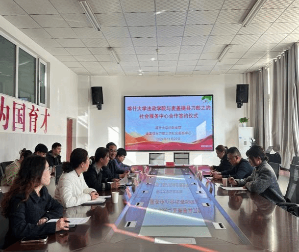 2024年11月22日下午,喀什大学法政学院与麦盖提县刀郎之约社会服务中心实践基地签约仪式在法政学院二楼会议室举行。麦盖提县刀郎之约社会服务中心负责人马德高、主任苏比努尔·阿布力海提、财务室主任阿提开姆·穆合塔尔、法政学院党总支副书记李宏斌、副院长赵雪军、南京理工大学银龄教授张曙、社会工作教研室主任周艳及多位社会工作专业教师参加会议,会议由赵雪军副院长主持。