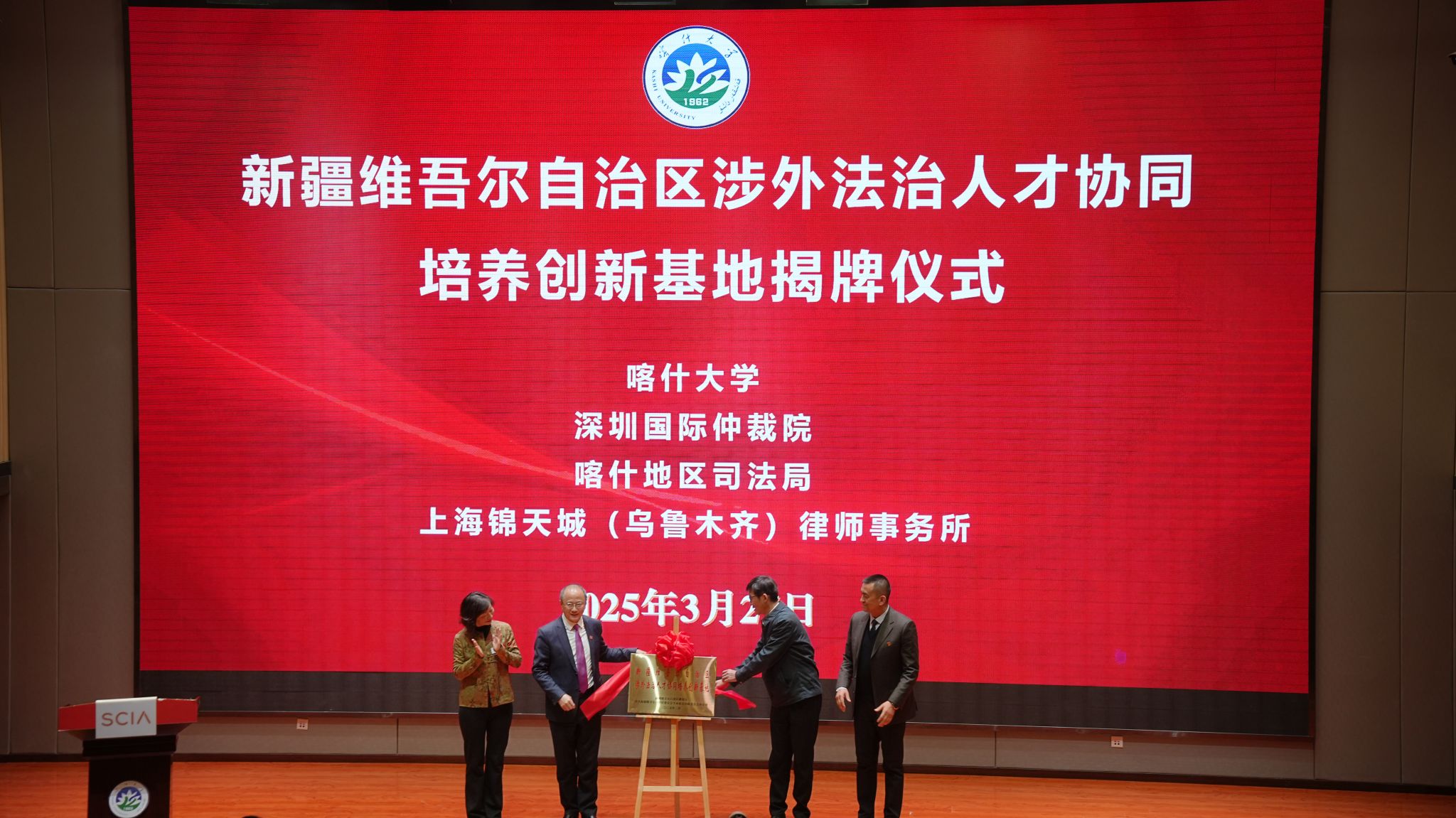 仪式上,喀什大学校党委副书记邓勇,喀什地区司法局党组副书记、局长外力·克衣木,深圳国际仲裁院院长刘晓春,深圳国际仲裁院副院长兼喀什分院院长安欣共同为新疆维吾尔自治区涉外法治人才协同培养创新基地揭牌。