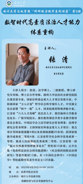 2025年4月29日下午,由喀什大学法政学院与喀什大学南疆经济与社会发展研究中心举办的法政学院实务系列讲座第九期在喀什大学新泉校区法政楼213会议室举行。扬州大学法治社会研究院院长兼首席专家、国家社科基金重大人才项目首席专家张清教授为法政学院师生带来主题为《数智时代高素质法治人才能力体系重构》的讲座。讲座由法政学院副院长赵雪军主持,法政学院法学专业教师代表及2024级研究生聆听讲座。