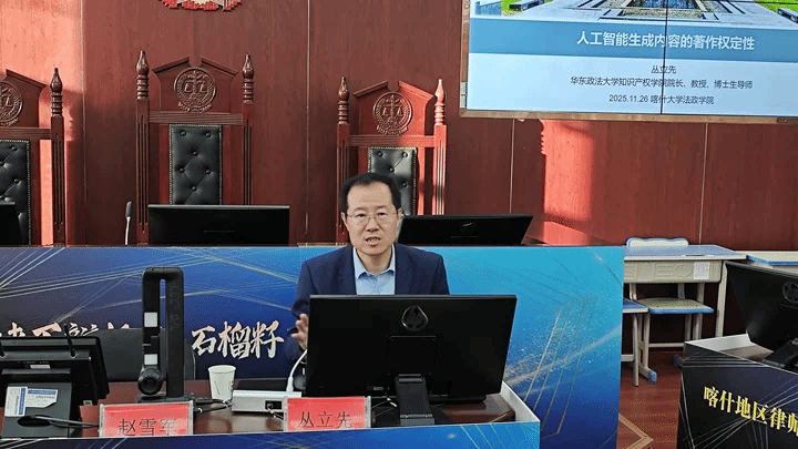 2025年1126日下午,法政学院与南疆经济与社会发展研究中心举办“法治与社会发展讲坛”第20讲座华东政法大学知识产权学院院长、博士生导师丛立先教授作题为人工智能生成内容的著作权定性的学术讲座。本次讲座由法政学院党委委员、副院长赵雪军主持,法学专业教师和研究生学生代表到场聆听